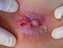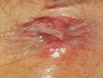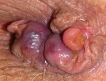 Hình ảnh trĩ ngoại ở ngoại hậu môn và đang gây viêm nhiễm, hoạt tử vùng da ngoài hậu môn. Cách trị trĩ ngoại là phải loại bỏ búi trĩ, kết hợp dùng thuốc giảm sưng, sát trùng, chống viêm...